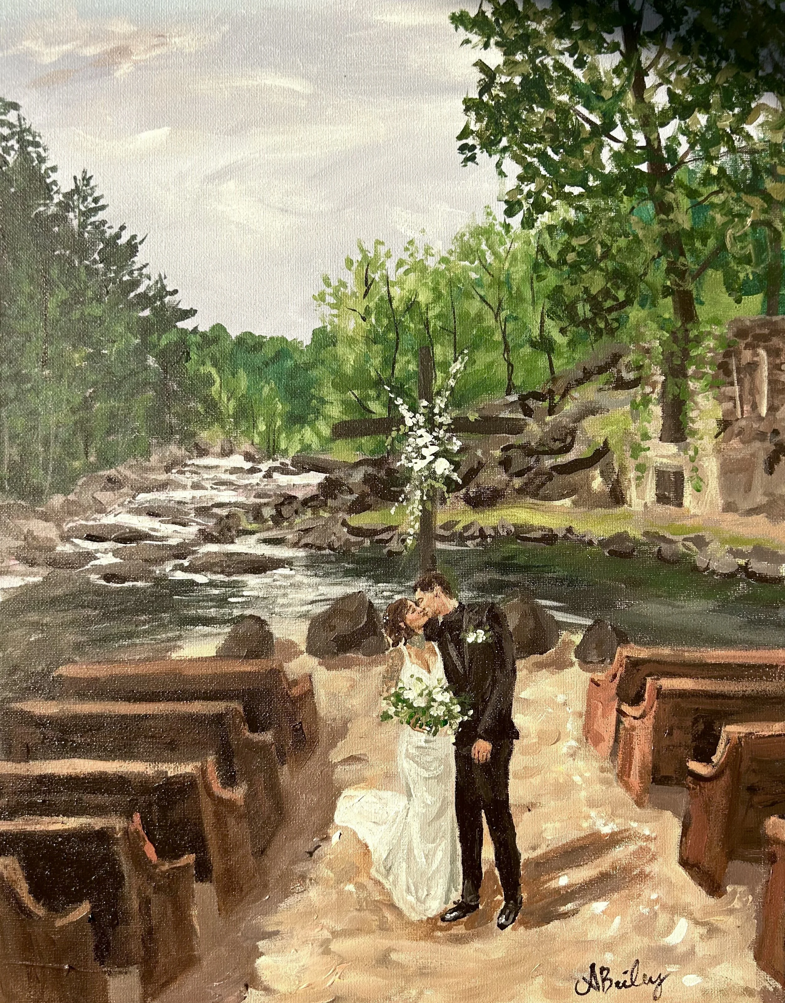 (Artist’s pick!) The landscape 24x18 painting gives a wider landscape feel making it more panoramic in appearance. This is a great size for a bride and groom who love the backdrop setting they’re getting married in front of. Price, including service, supplies and touch ups is + $400 to the classic price.
